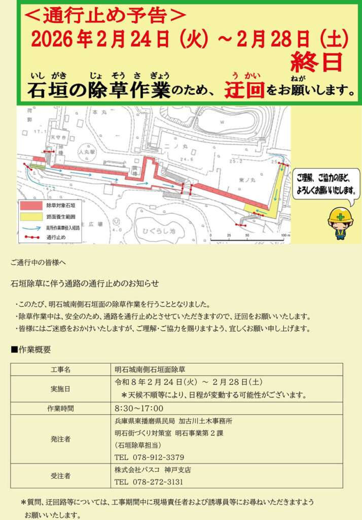 【通行止め】石垣の除草作業のため、迂回をおねがいします。